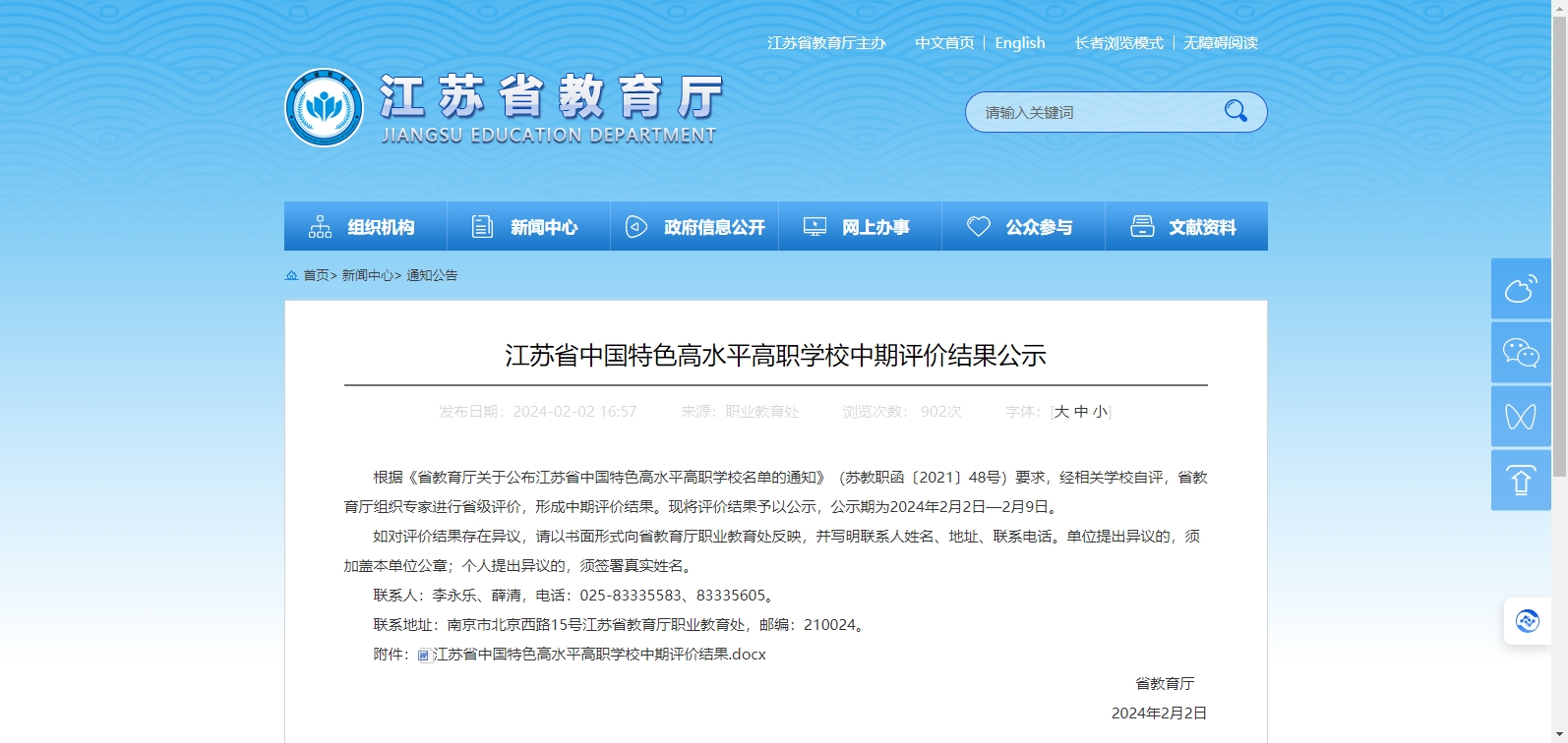 根據(jù)《省教育廳關(guān)于公布江蘇省中國(guó)特色高水平高職學(xué)校名單的通知》(蘇教職函〔2021〕48號(hào))要求,經(jīng)相關(guān)學(xué)校自評(píng),省教育廳組織專家進(jìn)行省級(jí)評(píng)價(jià),形成中期評(píng)價(jià)結(jié)果?,F(xiàn)將評(píng)價(jià)結(jié)果予以公示,公示期為2024年2月2日—2月9日。