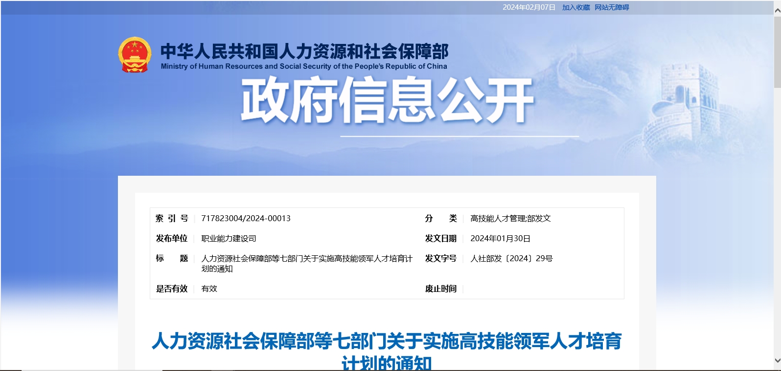根據(jù)中共中央辦公廳、國務(wù)院辦公廳《關(guān)于加強新時代高技能人才隊伍建設(shè)的意見》要求,人力資源社會保障部、國家發(fā)展改革委、教育部、科技部、財政部、國務(wù)院國資委、全國總工會聯(lián)合制定了高技能領(lǐng)軍人才培育計劃?,F(xiàn)印發(fā)給你們,請結(jié)合實際做好組織實施工作。