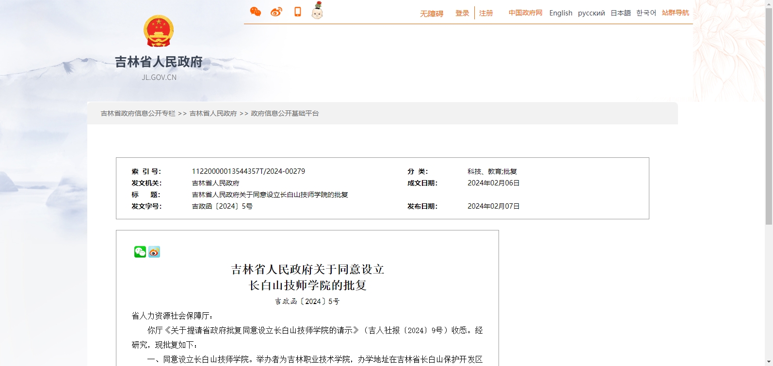 你廳《關(guān)于提請省政府批復(fù)同意設(shè)立長白山技師學(xué)院的請示》(吉人社報〔2024〕9號)收悉。經(jīng)研究,現(xiàn)批復(fù)如下: