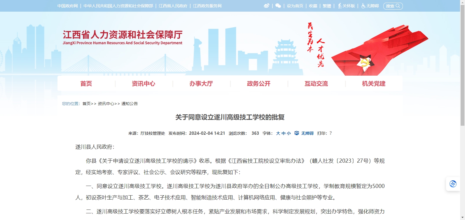 你縣《關(guān)于申請設(shè)立遂川高級技工學校的請示》收悉。根據(jù)《江西省技工院校設(shè)立審批辦法》(贛人社發(fā)〔2023〕27號)等規(guī)定,經(jīng)實地考察、專家評議、社會公示、會議研究等程序,現(xiàn)批復如下: