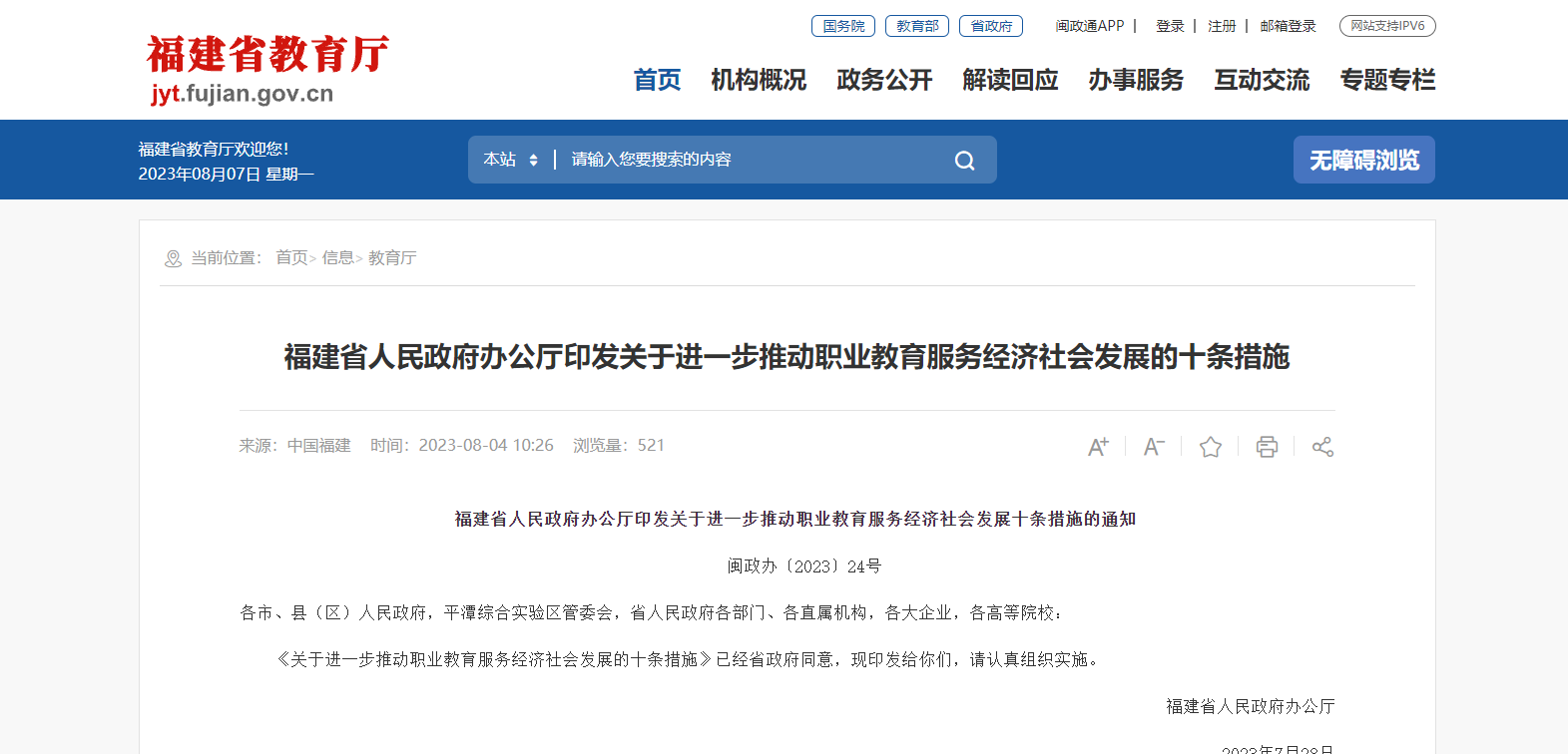福建省人民政府辦公廳印發(fā)關(guān)于進(jìn)一步推動(dòng)職業(yè)教育服務(wù)經(jīng)濟(jì)社會(huì)發(fā)展的十條措施
