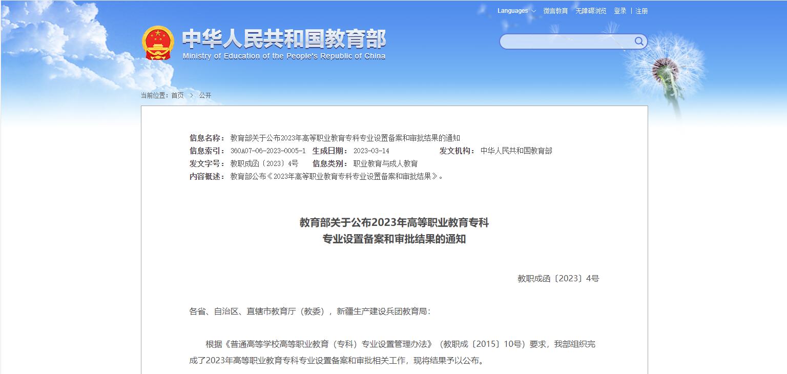 日前,教育部組織完成了2023年高等職業(yè)教育??茖I(yè)設(shè)置備案和審批相關(guān)工作,并公布結(jié)果,經(jīng)省級(jí)教育行政部門備案并在教育部匯總的2023年擬招生專業(yè)點(diǎn)共65808個(gè),備案結(jié)果可在全國職業(yè)院校專業(yè)設(shè)置管理......
