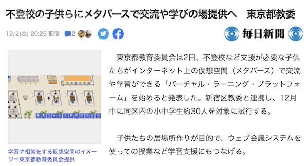 據(jù)《每日新聞》等日媒報(bào)道,東京都教育委員會(huì)12月2日宣布,為了幫助厭學(xué)兒童,將通過(guò)元宇宙平臺(tái)幫助他們進(jìn)行日常學(xué)習(xí)和交流。東京都教委將和新宿區(qū)教委合作,在12月以新宿區(qū)大約30名中小學(xué)生為對(duì)象先進(jìn)行試運(yùn)......