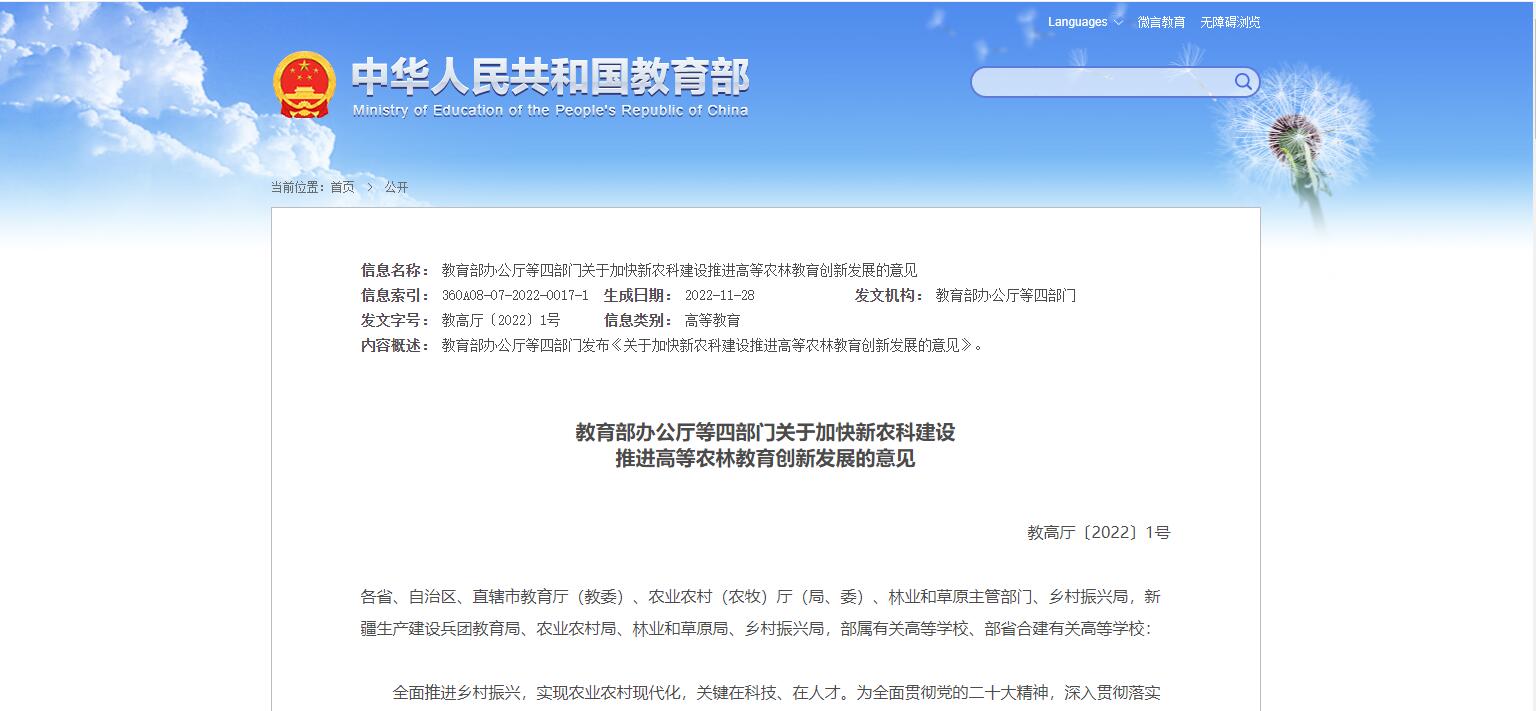 教育部辦公廳等四部門(mén)關(guān)于加快新農(nóng)科建設(shè)推進(jìn)高等農(nóng)林教育創(chuàng)新發(fā)展的意見(jiàn)