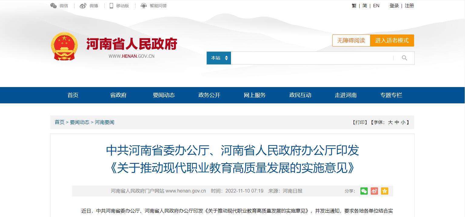 中共河南省委辦公廳、河南省人民政府辦公廳印發(fā) 《關(guān)于推動(dòng)現(xiàn)代職業(yè)教育高質(zhì)量發(fā)展的實(shí)施意見(jiàn)》